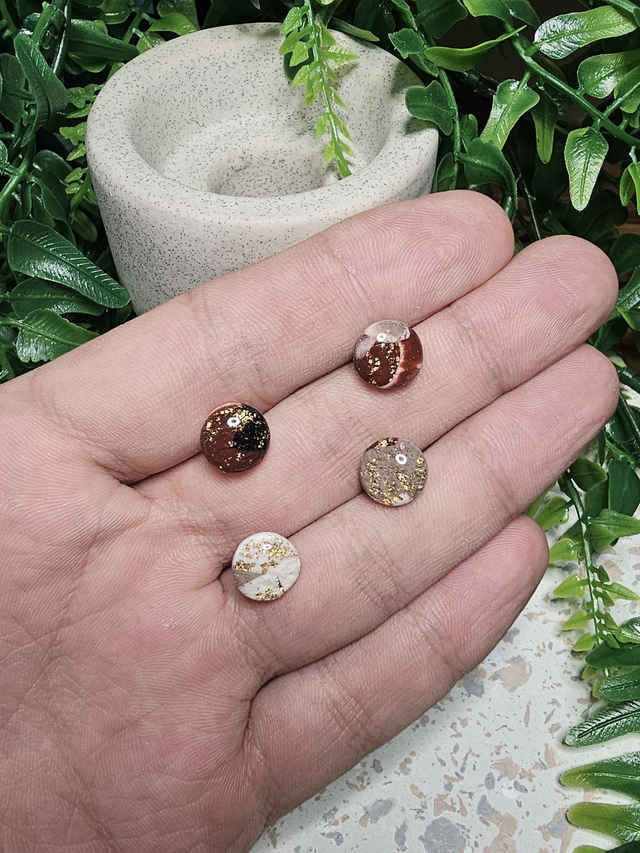 Chaque pièce est façonnée à la main en pâte polymère, sculptée en fines volutes superposées pour créer un relief organique et élégant. Les couleurs bruns chauds, ivoire délicat et touches d’ébène se mêlent harmonieusement, puis sont sublimées par des inclusions de feuilles d’or
