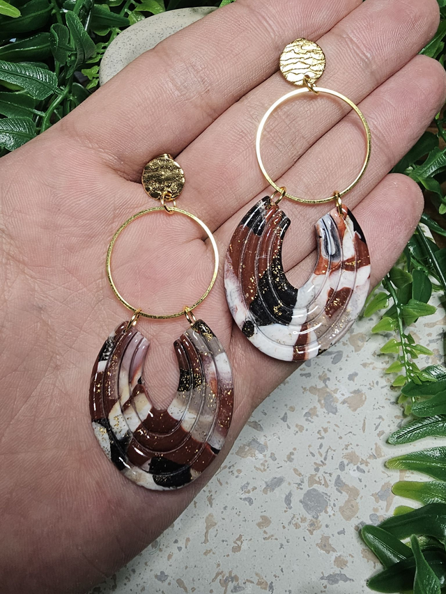 Chaque pièce est façonnée à la main en pâte polymère, sculptée en fines volutes superposées pour créer un relief organique et élégant. Les couleurs bruns chauds, ivoire délicat et touches d’ébène se mêlent harmonieusement, puis sont sublimées par des inclusions de feuilles d’or